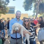 Είναι ένα μικρό χαριτωμένο κουτάβι που μασάει ένα κόκκαλο ενώ κάθεται σε ένα χαλί που έχει διαγώνιες ρίγες.
