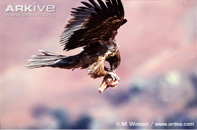 Κι ενώ τα οστά ζώων μεγέθους προβάτου τα καταβροχθίζει σχεδόν ολόκληρα, δεν είναι διατεθειμένο να παραβλέψει τα κόκαλα μεγαλύτερων ζώων. Και με το ράμφος και τα νύχια του σχετικά αδύναμα, παίρνει τα κόκαλα και τα γκρεμοτσακίζει από ψηλά σπάζοντάς τα στη στιγμή. Με την οξεία όρασή του, σπανίως λαθεύει μάλιστα στο σημάδι του.