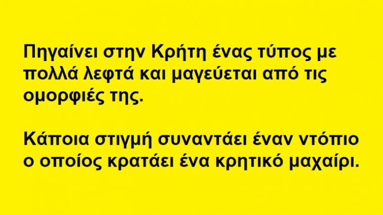 Πηγαίνει στην Κρήτη ένας τύπος με πολλά λεφτά και μαγεύεται από τις ομορφιές της. Κάποια στιγμή συναντάει έναν ντόπιο ο οποίος κρατάει ένα κρητικό μαχαίρι.