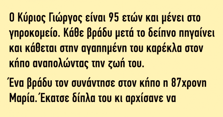 Ένα βράδυ τον συνάντησε στον κήπο η 87χρονη Μαρία. Έκατσε δίπλα του κι αρχίσανε να συζητάνε.