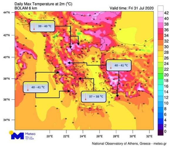 Σύμφωνα με τα προγνωστικά στοιχεία του Εθνικού Αστεροσκοπείου Αθηνών / meteo.gr, μικρή περαιτέρω άνοδο αναμένεται να σημειώσει η θερμοκρασία την Παρασκευή 31/07, ξεπερνώντας κατά τόπους τους 40 βαθμούς Κελσίου.