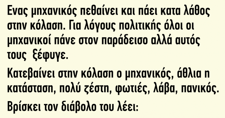 Κατεβαίνει στην κόλαση ο μηχανικός, άθλια η κατάσταση, πολύ ζέστη,φωτιές, λάβα, υδρατμοί, πανικός. Βρίσκει τον διάβολο του τα λέει ένα χεράκι και σε ένα μήνα μέσα έχει εγκαταστήσει κλιματισμό, υδρομασάζ,τουαλέτες και κυλιόμενες σκάλες.