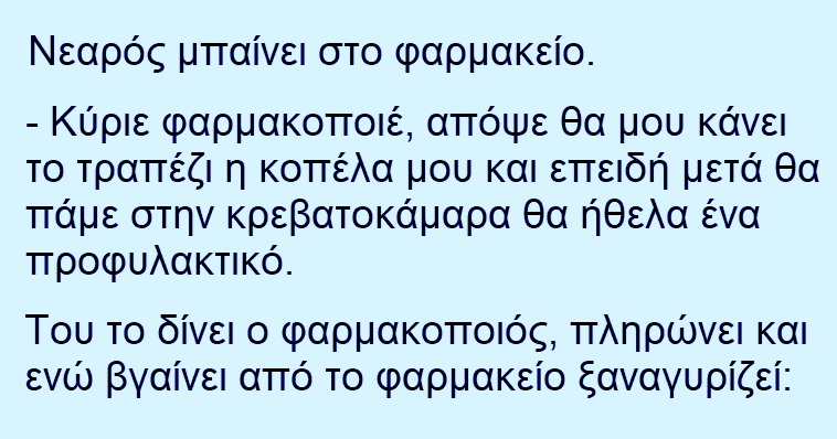 -Κύριε φαρμακοποιέ απόψε θα μου κάνει το τραπέζι η κοπέλα μου και επειδή μετά θα πάμε στην κρεβατοκάμαρα, θα μπορούσατε να μου δώσετε ένα προφυλακτικό;