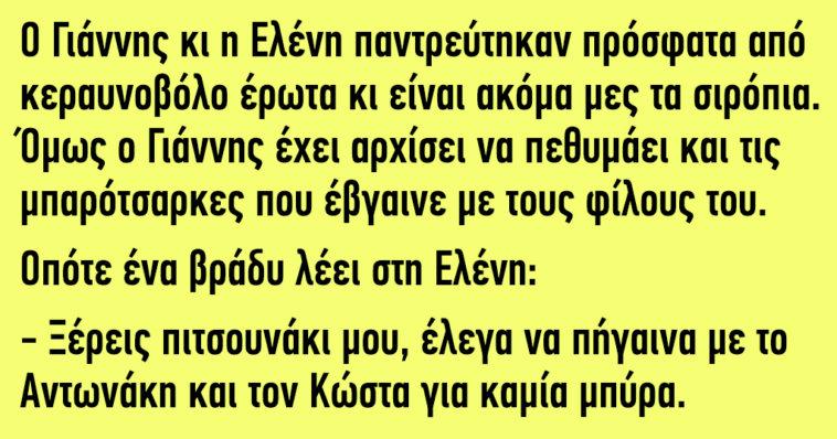 Ο Γιάννης κι η Ελένη παντρεύτηκαν πρόσφατα από κεραυνοβόλο έρωτα κι είναι ακόμα μες τα σιρόπια. Όμως ο Γιάννης έχει αρχίσει να πεθυμάει και τις μπαρότσαρκες που έβγαινε με τους φίλους του. Οπότε ένα βράδυ λέει στη Ελένη: