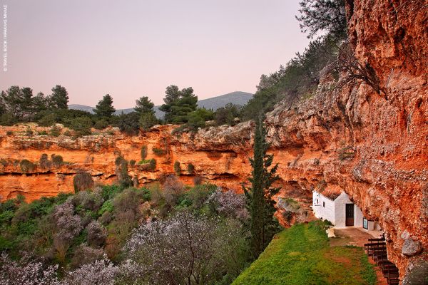Μια δεύτερη είσοδος, που κατασκευάστηκε από τους μοναχούς, οδηγεί στο εσωτερικό της σπηλιάς, όπου βρίσκονται οι δύο σκαλιστές εκκλησίες, μια πέτρινη κολυμπήθρα, μια μικρή δεξαμενή και μια οπή γνωστή ως «Ασκηταριό» από την οποία ανέρχονται με σχοινί οι ασκητές και λέγεται πως εκεί άφησε το σημάδι του το άλογο του Αγίου Γεωργίου. …