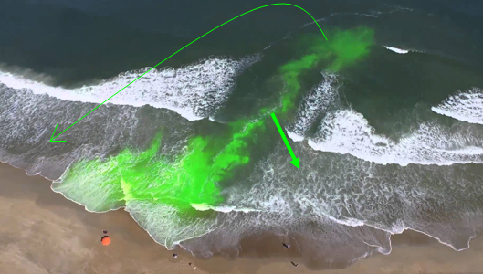 1) Υπάρχει μια διακοπή στην κυματογραμμή όπως φαίνεται στην παραπάνω εικόνα. Αυτό συμβαίνει λόγο της τοπογραφίας του βυθού που έχει ως αποτέλεσμα ο όγκος του υγρού μέσα στα όρια του ρεύματος να κινείται αντίθετα απο την φορά των κυμάτων.