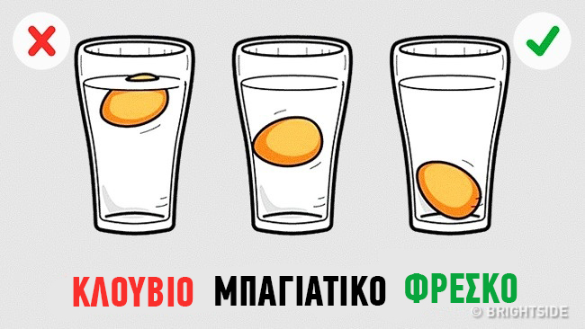 Πώς να το ελέγξετε: Πάρτε μια κανάτα με κρύο νερό και τοποθετήστε μέσα ένα αυγό. Ένα οριζόντια βυθισμένο αυγό είναι φρέσκο. Ένα αυγό που επιπλέει ελαφρώς σημαίνει ότι δεν είναι τόσο φρέσκο, αλλά μπορεί να χρησιμοποιηθεί για το μαγείρεμα. Εάν ένα αυγό επιπλέει στην επιφάνεια, είναι καλύτερα να το πετάξετε.