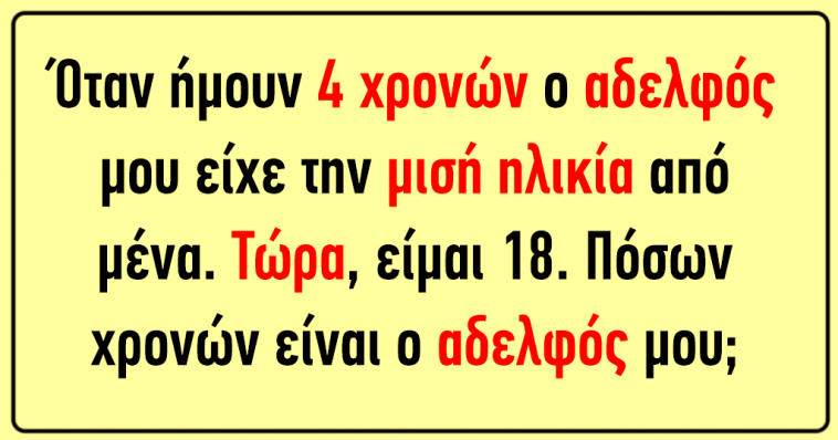 12. Όταν ήμουν 4 χρονών, ο αδερφός μου είχε την μισή ηλικία από μένα. Τώρα είμαι 18. Πόσων χρονών είναι ο αδερφός μου;