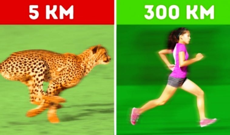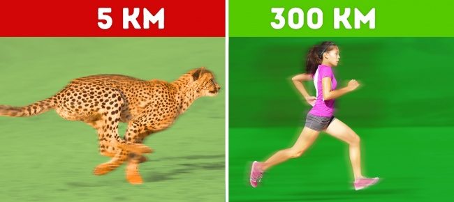 1. Τα ζώα δεν μπορούν να τρέξουν για μεγάλες αποστάσεις. Τα περισσότερα ζώα μπορούν να τρέξουν πιο γρήγορα από τον άνθρωπο, γιατί έχουν τέσσερα πόδια. Αλλά όσον αφορά τις μεγάλες αποστάσεις, οι άνθρωποι ξεπερνάνε τα ζώα. Δροσιζόμαστε με το να ιδρώνουμε, όχι τρέχοντας. Οι άνθρωποι μπορούν να διατηρήσουν χαμηλή θερμοκρασία σε ταχύτητες και αποστάσεις που θα υπερθέρμαναν τα ζώα, αναγκάζοντας τα να σταματήσουν. Μπράβο στην εξέλιξη!