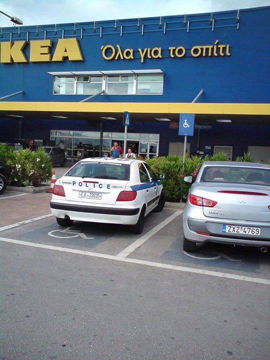 Περιπολικό της ΕΛ.ΑΣ πάρκαρε σε πάρκινγκ αναπήρων του ΙΚΕΑ, μάλλον για να προλάβουν ζεστά τα κεφτεδάκια.
