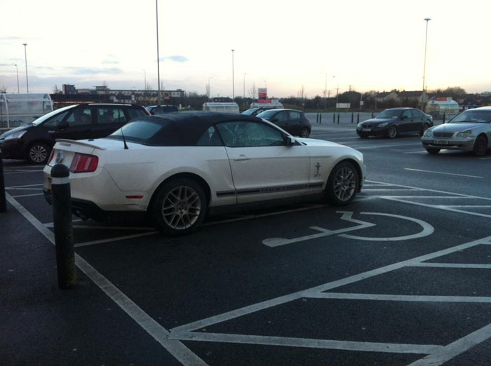 Σε ένα σχεδόν άδειο χώρο στάθμευσης στην Ιρλανδία, μια Mustang καταλαμβάνει 2 θέσεις αναπήρων.