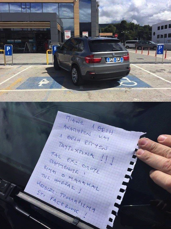 «Παρακαλώ μην παρκάρετε σαν γάιδαρος σε σημεία για αναπήρους. Τα σημεία αυτά διαθέτουν επιπλέον χώρο για κάποιο λόγο».