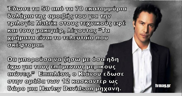 1. Έδωσε τα 50 από τα 70 εκατομμύρια δολάρια της αμοιβής του για την τριλογία Matrix στους τεχνικούς εφέ και τους μακιγιέρ, λέγοντας “Τα χρήματα είναι το τελευταίο που σκέφτομαι. Θα μπορούσα να ζήσω με όσα ήδη έχω για τους επόμενους μερικούς αιώνες.” Επιπλέον, ο Κιάνου έδωσε στην ομάδα των 12 κασκαντέρ ως δώρο μια Harley Davidson μηχανή.