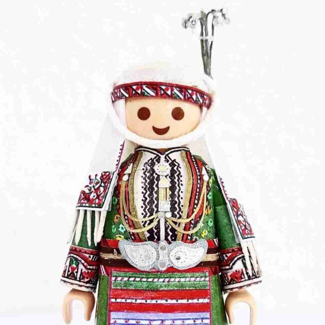 «Όχι, απλώς τότε γεννήθηκε η ιδέα. Το θυμήθηκα ξανά πριν από περίπου τρία χρόνια, όταν έφτιαξα την πρώτη ολοκληρωμένη φορεσιά πάνω σε ένα από τα παιδικά playmobil μου. Α, μερικά από αυτά που φωτογραφίζουμε είναι τα playmobil των παιδικών μου χρόνων! Όπως και να έχει, η πρώτη φορεσιά έγινε με πενιχρά υλικά και κόλλησα όπως όπως τα κομμάτια με σελοτέιπ, ούτε καν με κόλλα. Ήταν η φορεσιά από το Pουμλούκι ή τον Γιδά, την Αλεξάνδρεια Ημαθίας δηλαδή. Πριν από δύο χρόνια ξεκίνησα να ασχολούμαι πλέον πιο “επαγγελματικά”. Όσο περνάει ο καιρός, προσέχω ακόμα περισσότερο τη λεπτομέρεια, μπορεί να χαλάσω μια στολή και να την ξαναφτιάξω από την αρχή λόγω μιας ατέλειας που ούτε εσύ ούτε κανείς άλλος δεν θα προσέξει. Διαβάζω και μελετώ με προσοχή τα πάντα για τη φορεσιά που πρόκειται να φτιάξω».