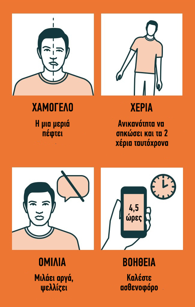 Αν παρατηρήσετε κάποιο από αυτά τα σημάδια καλέστε αμέσως ασθενοφόρο. Να θυμάστε ότι οι γιατροί έχουν μόλις 4.5 ώρες για να μπορέσουν να σώσουν έναν άνθρωπο και να τον επαναφέρουν σε μια φυσιολογική ζωή.