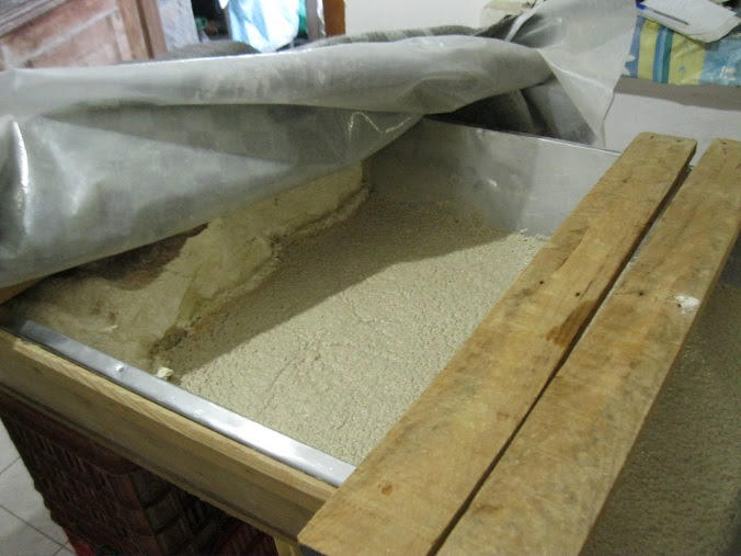 Δεν είχαμε σήμερα κουνενό, και έτσι στα 35 κιλά αλεύρι βάλαμε 150 γραμμάρια μαγιά, ενα κιλό ζάχαρη, και 400 γραμμάρια αλάτι.