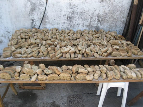Ένα ένα ψωμί, το έβγαζε ο Μανώλης απ’ το φούρνο , και μείς ζεστό καθώς ήταν, το κόβαμε σε ντάγκους, όπως ήταν χαραγμένα με το μαχαίρι πρίν, και το ξαναβάζαμε στις τάβλες.