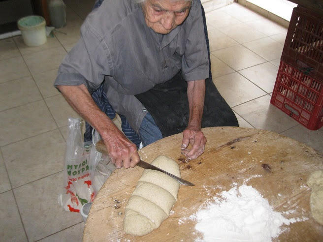 Η παπαδιά μας έδειχνε πως γίνεται το ζύμωμα, πως αποσπούσε μια μεγάλη ποσότητα ζύμης και την έκανε τούμπα για να τη ζυμώνει.
