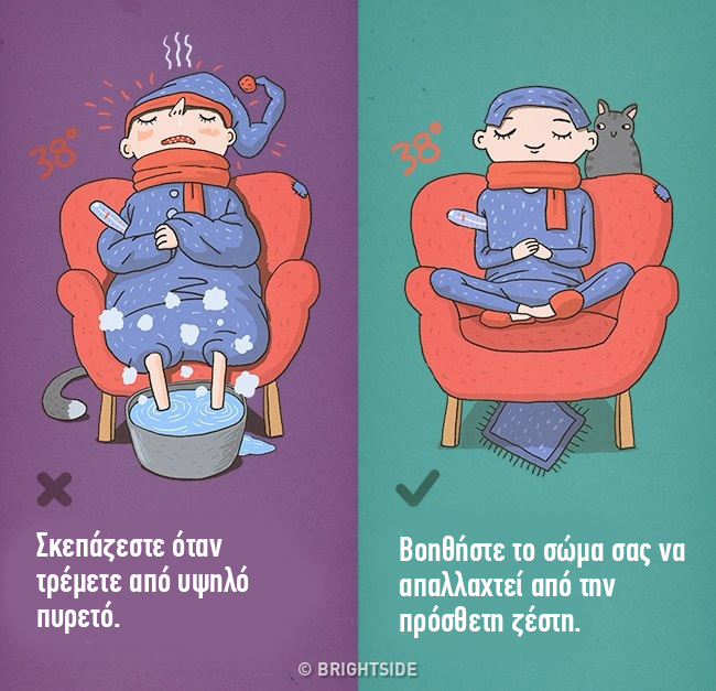 Όταν είστε άρρωστοι, το αίσθημα της ζέστης όταν τρέμετε ταυτόχρονα υποδηλώνει ότι η θερμοκρασία του σώματος σας αυξάνεται. Όταν σκεπαζόμαστε ή φοράμε πολλά ρούχα για να ζεσταθούμε, η θερμοκρασία μας ανεβαίνει ακόμα πιο γρήγορα. Αν και η θερμότητα μας βοηθά να καταπολεμήσουμε τη μόλυνση, η θερμοκρασία του σώματος που είναι υψηλότερη από 38 ° C κάνει περισσότερο κακό στο σώμα παρά καλό.