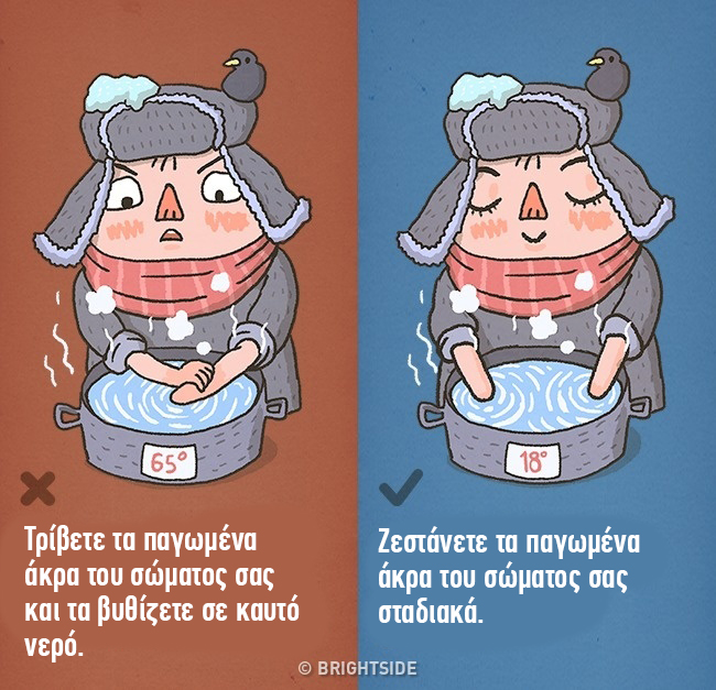 Όταν τρίβετε τα παγωμένα άκρα, βλάπτετε τα τριχοειδή σας, πράγμα που χειροτερεύει την κατάσταση. Το ζεστό νερό είναι επίσης μια σωστή μέθοδος για να βοηθήσει εδώ. Εάν έχετε παγώσει, πρέπει να προσπαθήσετε να θερμαίνετε αργά τα τμήματα του σώματος που έχουν προσβληθεί – τοποθετήστε τα χέρια σας σε κρύο νερό αυξάνοντας σταδιακά τη θερμοκρασία του.