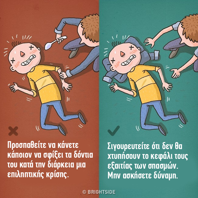 Μπορείτε να σπάσετε τα δόντια κάποιου εάν βάλετε κάτι στο στόμα του εκείνη την στιγμή. Κατά τη διάρκεια μιας κρίσης, ένας επιληπτικός άνθρωπος δεν μπορεί να δαγκώσει τη γλώσσα του, καθώς τεντώνεται με μεγάλη δύναμη. Μπορούν να την δαγκώνουν μόνο ελαφρώς, αλλά αυτό δεν θα προκαλέσει σοβαρή βλάβη. Το καλύτερο που μπορείτε να κάνετε για να βοηθήσετε είναι να τοποθετήσετε κάτι μαλακό κάτω από το κεφάλι τους, καθώς αυτό θα τους βοηθήσει να αποφύγουν οποιαδήποτε διάσειση του κρανίου. Όταν έχουν περάσει οι σπασμοί, γυρίστε το άτομο στο πλάι.