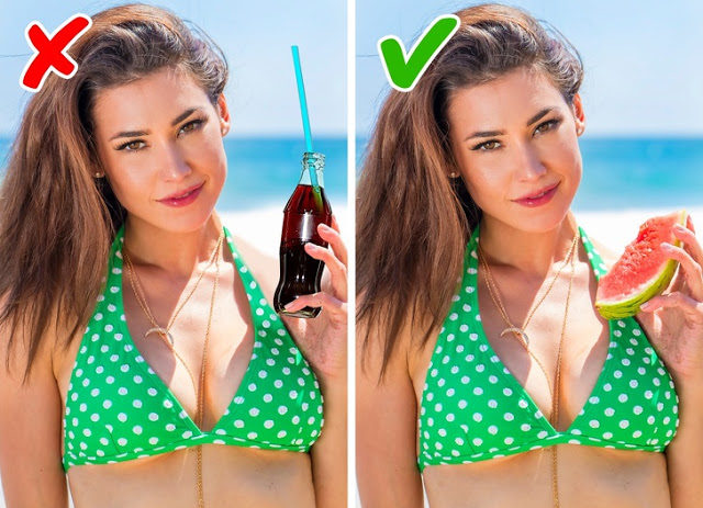 Καλό θα ήταν να μην τρώτε πριν πάτε στην παραλία. Επίσης, καλό θα ήταν να αποφεύγετε τροφές που προκαλούν φούσκωμα, όπως ο αρακάς, το λάχανο, το καλαμπόκι, τα κράκερ, τα λουκάνικα, τα αναψυκτικά και τα κοκτέιλ.