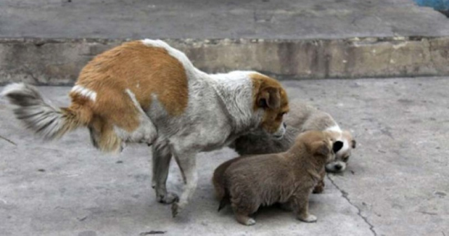 Τα τέσσερα υγιέστατα (και αξιαγάπητα) κουτάβια της, την είχαν προφανώς από την πρώτη στιγμή ανάγκη. Και τότε το ένστικτο της επιβίωσης με το ένστικτο της μητρότητας, έδωσαν αυτό το θαύμα που παρατηρείτε: