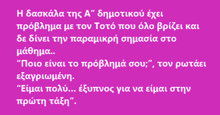 έξυπνος για να είμαι στην πρώτη τάξη”. Απαντά ο Τοτός με ύφος.’Η αδερφή μου είναι στην τρίτη τάξη και είμαι πολύ εξυπνότερος από αυτήν. Πιστεύω πως πρέπει να πάω τουλάχιστον στην τρίτη κι εγώ”.