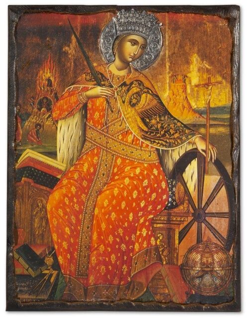 Η Αγία Αικατερίνη, αρχικά γνωστή ως Δωροθέα, μετονομάστηκε μετά τη βάπτισή της, φέροντας το όνομα που συμβολίζει την αγνότητα. Ζώντας στην Αλεξάνδρεια κατά την περίοδο των διωγμών, υπέστη φρικτά βασανιστήρια, μένοντας αμετακίνητη στην πίστη της. Ο θρύλος του «τροχού των βασανιστηρίων» αποτυπώνει την θεϊκή επέμβαση υπέρ της, καθώς το φρικτό όργανο μαρτυρίου καταστράφηκε πριν την αγγίξει. Ο αποκεφαλισμός της σημαδεύτηκε από το θαυματουργό θέαμα της ροής γάλακτος αντί αίματος, ενώ το σώμα της μεταφέρθηκε μυστηριωδώς στο Όρος Σινά.