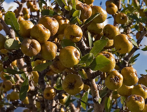 - Ο καρπός της είναι μικρός και σφαιρικός, με διάμετρο περίπου 2 – 3 εκατοστά, πράσινος και στυφός όταν είναι άγουρος. Όταν ωριμάζει παίρνει το καστανοκίτρινο χρώμα και είναι πιο γλυκός.
