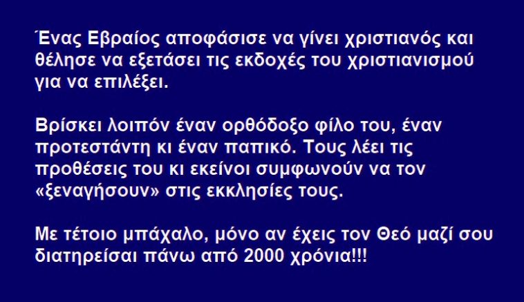 Ένας Εβραίος αποφάσισε να γίνει χριστιανός και θέλησε να εξετάσει τις εκδοχές του χριστιανισμού για να επιλέξει. Βρίσκει λοιπόν έναν ορθόδοξο φίλο του, έναν προτεστάντη κι έναν παπικό. Τους λέει τις προθέσεις του κι εκείνοι συμφωνούν να τον «ξεναγήσουν» στις εκκλησίες τους.