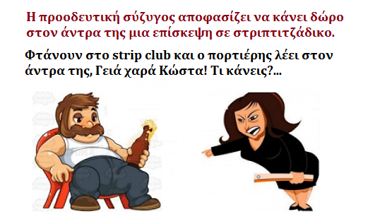 Φτάνουν στο στρiπ club και ο πορτιέρης λέει στον άντρα της, Γειά χαρά Κώστα! Τι κάνεις?