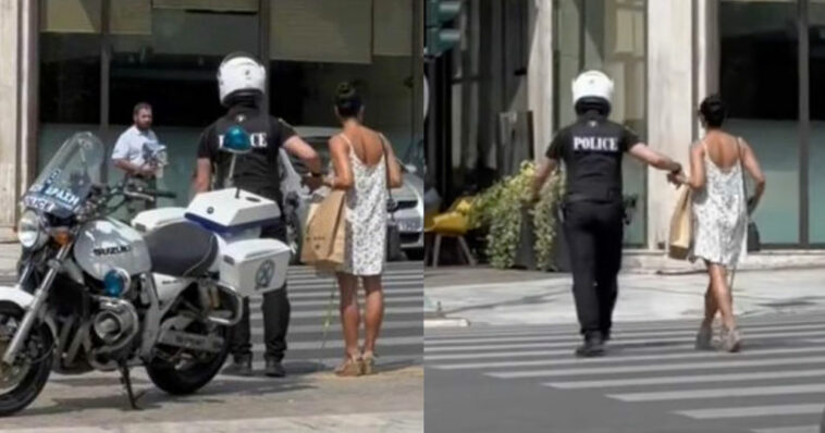 Όταν αντιλήφθηκε το περιστατικό ο άντρας της Ελληνικής Αστυνομίας, έπιασε τη γυναίκα από το χέρι, διασχίζοντας μαζί της τη διάβαση. Με αυτό τον τρόπο διασφάλισε ότι η γυναίκα θα έφτανε με ασφάλεια στην απέναντι μεριά του δρόμου.