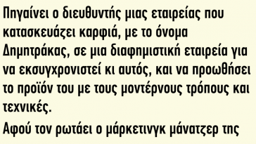 in Αστεία Ο διευθυντής μίας εταιρείας που κατασκευάζει καρφιά σε μία διαφημιστική εταιρεία για να εκσυγχρονιστεί κι αυτός, και να προωθήσει το προϊόν του με τους μοντέρνους τρόπους και τεχνικές