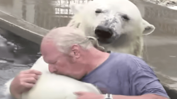 Άνδρας κολυμπά με μια λευκή πολική αρκούδα που είχε μεγαλώσει για πάνω από δύο δεκαετίες
