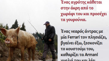 in Ιστορίες Ένας αγρότης ήταν στο χωράφι του και πρόσεχε τα γουρούνια. Τότε, τον πλησιάζει ένας νεαρός οδηγώντας μία Ferrari…