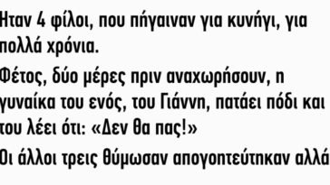 in Ιστορίες Ήταν 4 φίλοι που πήγαιναν για κυνήγι για πολλά χρόνια. Φέτος, δύο μέρες πριν αναχωρήσουν, η γυναίκα του ενός, του Γιάννη, πατάει πόδι και του λέει ότι: “δεν θα πάς!”