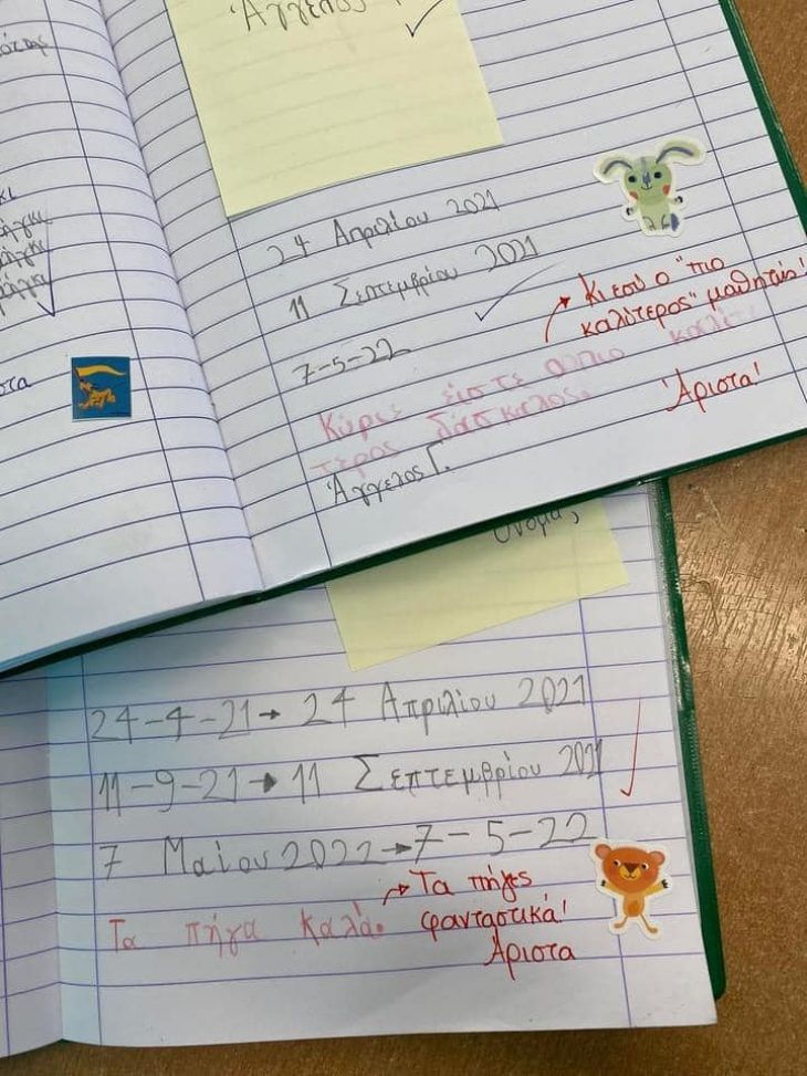 Αυτή τη φορά ενθουσιαστήκαμε με τα σχόλια ενθάρρυνσης που έγραψε όταν πήρε τα τετράδια των μαθητών και τα λόγια που γράφει στον καθένα εξ αυτών στο πλαίσιο της επιβράβευσης ως κίνητρο μάθησης.