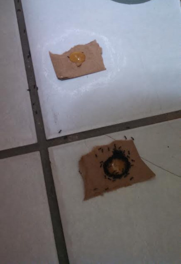 Και η κιμωλία είναι αποτελεσματική κατά των μυρμηγκιών. Σχεδιάστε έναν κύκλο με κιμωλία γύρω από ένα δόλωμα, αλλά όχι γύρω από το άλλο, όπως στην φωτογραφία.