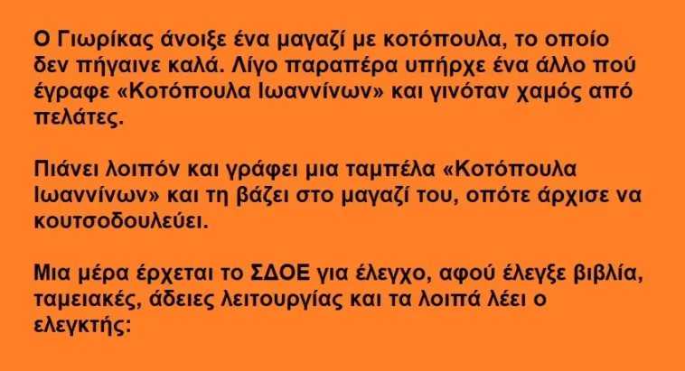 Πιάνει λοιπόν και γράφει μια ταμπέλα «Κοτόπουλα Ιωαννίνων» και τη βάζει στο μαγαζί του, οπότε άρχισε να κουτσοδουλεύει.Μια μέρα έρχεται το ΣΔΟΕ για έλεγχο, αφού έλεγξε βιβλία, ταμειακές, άδειες λειτουργίας και τα λοιπά λέει ο ελεγκτής: