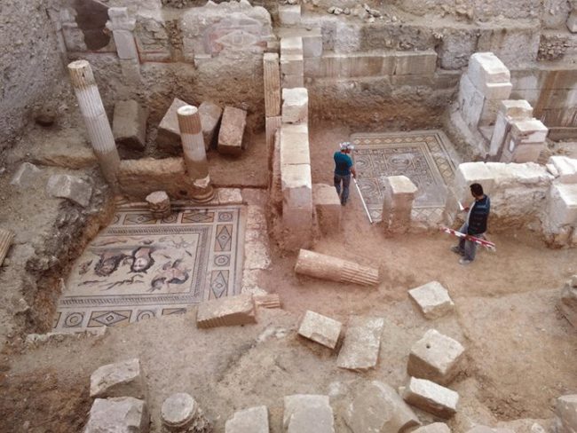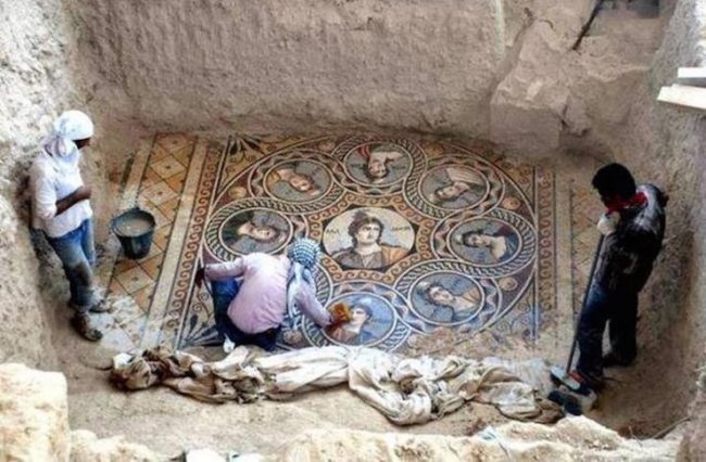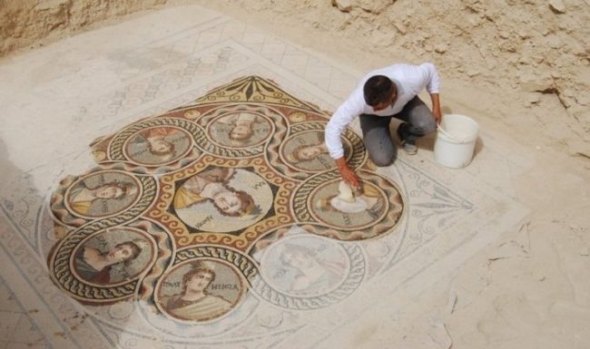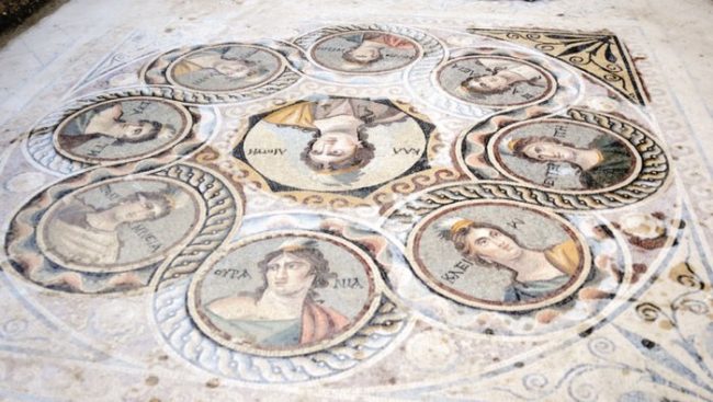Το ένα ψηφιδωτό, που παριστά τις εννέα Μούσες, σε πορτρέτα, κοσμούσε μεγάλο δωμάτιο στο σπίτι που οι αρχαιολόγοι έχουν ονομάσει «Οίκος των Μουσών».