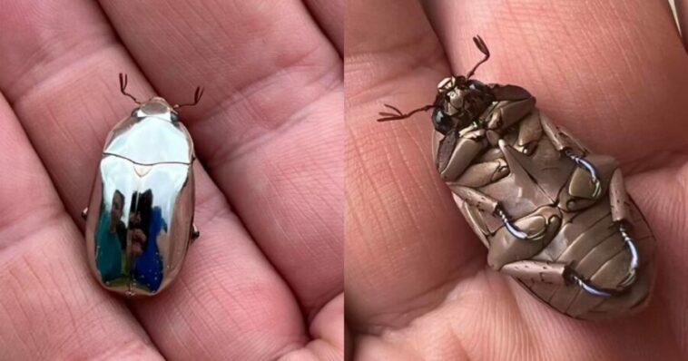 Μπορεί να μοιάζει με παιδικό μεταλλικό παιχνίδι, μπορεί αρκετοί να σχολίασαν τις φωτογραφίες ως ψεύτικες, fake κατασκεύασμα της “τεχνητής νοημοσύνης”, όμως δεν είχαν δίκιο! Το “ασημένιο σκαθάρι” Είναι ένα είδος σπάνιο σκαθαριού και είναι γνωστό με το όνομα Chrysina limbata.