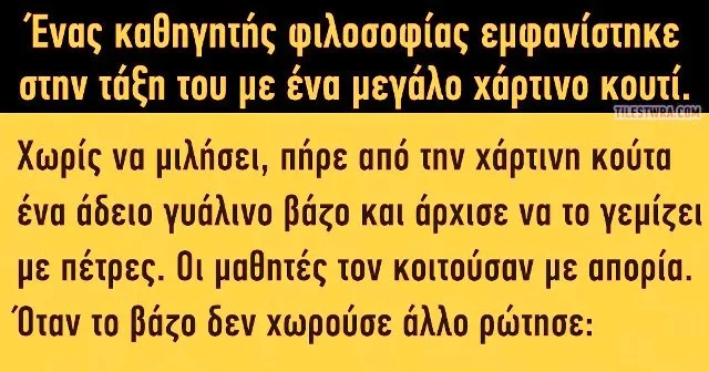Ένας καθηγητής φιλοσοφίας εμφανίστηκε στην τάξη του με ένα μεγάλο χάρτινο κουτί. Χωρίς να μιλήσει, πήρε από την χάρτινη κούτα ένα άδειο γυάλινο βάζο και άρχισε να το γεμίζει με πέτρες.