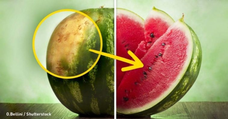 Το μεγάλο κίτρινο σημάδι στο κάτω μέρος του καρπουζιού, είναι το σημείο όπου το καρπούζι ακουμπούσε το χώμα ενώ μεγάλωνε. Στο ώριμο καρπούζι αυτό το σημάδι θα πρέπει να έχει ένα ανοιχτό κίτρινο ή πορτοκαλί-κίτρινο χρώμα, δεν πρέπει όμως να είναι άσπρο.
