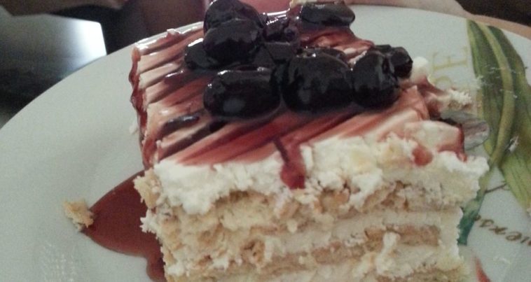 Σε πυρέξ στρώνουμε μπισκότα-κρεμα εναλλάξ μέχρι να μας τελειώσουν.