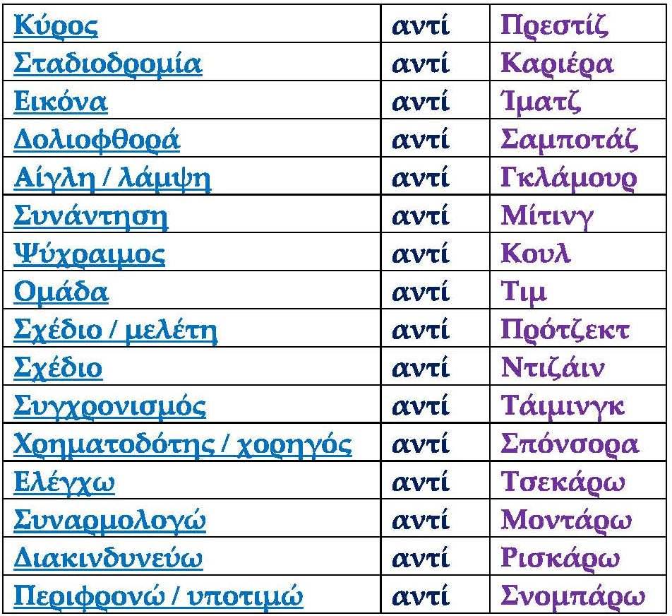 Έχουμε τόσο ωραία και πλούσια γλώσσα, που είναι απορίας άξιο γιατί συνήθως χρησιμοποιούμε ξένες λέξεις και εκφράσεις στο καθημερινό μας λεξιλόγιο.