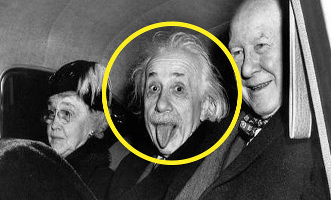 Τα φλας δεν σταματούν να απαθανατίζουν έναν άνθρωπο φανερά κουρασμένο με ύφος βαρεμάρας. Ένας φωτογράφος πλησιάζει και του ζητάει ένα τελευταίο χαμόγελο. Ο νομπελίστας φυσικός απλώς γουρλώνει τα μάτια, βγάζει την γλώσσα και του χαρίζει την πιο διάσημη πόζα του.