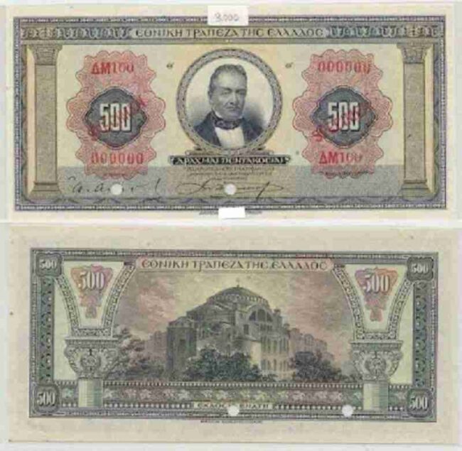 Το πεντακοσάρικο με παράσταση της Αγια Σοφιάς σχεδιάστηκε το 1921 από την American Banknote Company και παραδόθηκε το 1923 ταυτόχρονα με τη Συνθήκη των Σεβρών, όταν το θωρηκτό «Αβέρωφ» βρισκόταν αγκυροβολημένο στην Πόλη, όπου είχαν αποβιβαστεί ελληνικά αγήματα με στόχο την πραγματοποίηση της Μεγάλης Ιδέας.