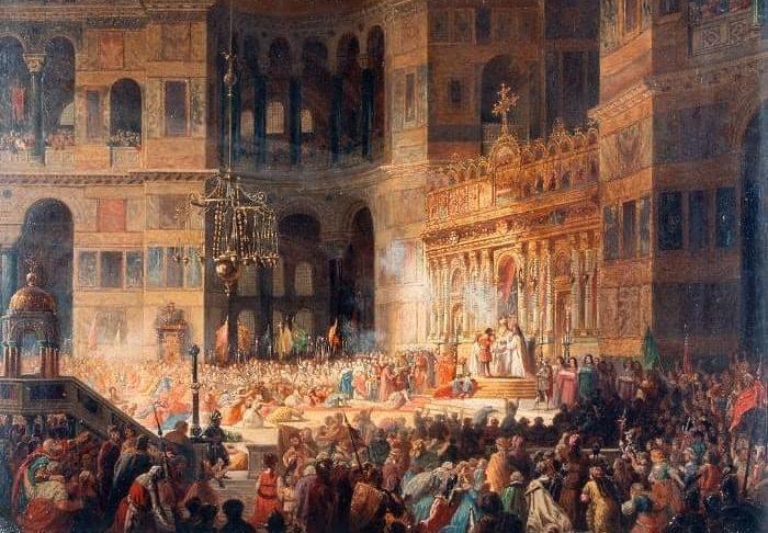 Έτσι «γεννήθηκε» ο διάσημος ρομαντικός πίνακας, φιλοτεχνημένος με λάδι σε καμβά 53 x 42. Αν και τον ζωγράφισε το 1849, η σκηνή μας μεταφέρει στον 12ο αιώνα. Ο βασιλιάς της Αγγλίας, Ριχάρδος ο Λεοντόκαρδος, μεταλαμβάνει από τα χέρια του Πατριάρχη, ενώ στα αριστερά στέκεται και ο αυτοκράτορας Αλέξιος Α’ Κομνηνός. Τριγύρω, η Αγιά Σοφιά κατάμεστη από πιστούς που παρακολουθούν το μυστήριο