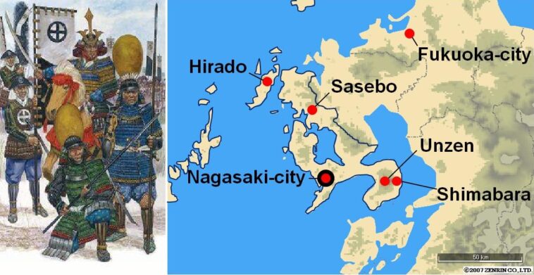 O Xριστιανισμός έφτασε στην Ιαπωνία το 1549 μ.Χ, όταν ο Ισπανός ιεραπόστολος Φραγκίσκος Ξαβέριος αφίχθηκε από την Κίνα μαζί με μια ομάδα Ιησουιτών συναδέλφων του και Ιαπώνων προσύλητων. Η νέα θρησκεία βρήκε σχεδόν άμεσα πρόσφορο έδαφος. Η δυτική χώρα γέμισε χριστιανικές εκκλησίες, ενώ σύντομα ιδρύθηκαν καθολικές ιεραποστολές στο Ναγκασάκι, σημαντικό λιμάνι στην νήσο Κιουσού, και στην πρωτεύουσα Κιότο στο κεντρικό Χονσού. Τέσσερις Ιάπωνες υποψήφιοι ιερείς και ιεραπόστολοι στάλθηκαν στην Ρώμη για να εκπαιδευτούν και να γνωρίσουν τον Πάπα, ενώ μέχρι το 1581 υπήρχαν στην χώρα 150.000 Χριστιανοί, εκ των οποίων οι 100.000 στο Κιουσού. Το σύμβολο του σταυρού έγινε κοινό στην Ιαπωνία, καθώς οι Χριστιανοί στρατιώτες τον έβαζαν πάνω στην πανοπλία τους, ενώ ακόμα και σε μικρές κοινότητες φτιάχνονταν απλοί ξύλινοι σταυροί που λατρεύονταν κατά τα πρότυπα του Σίντο, της αρχέγονης ιαπωνικής θρησκείας.